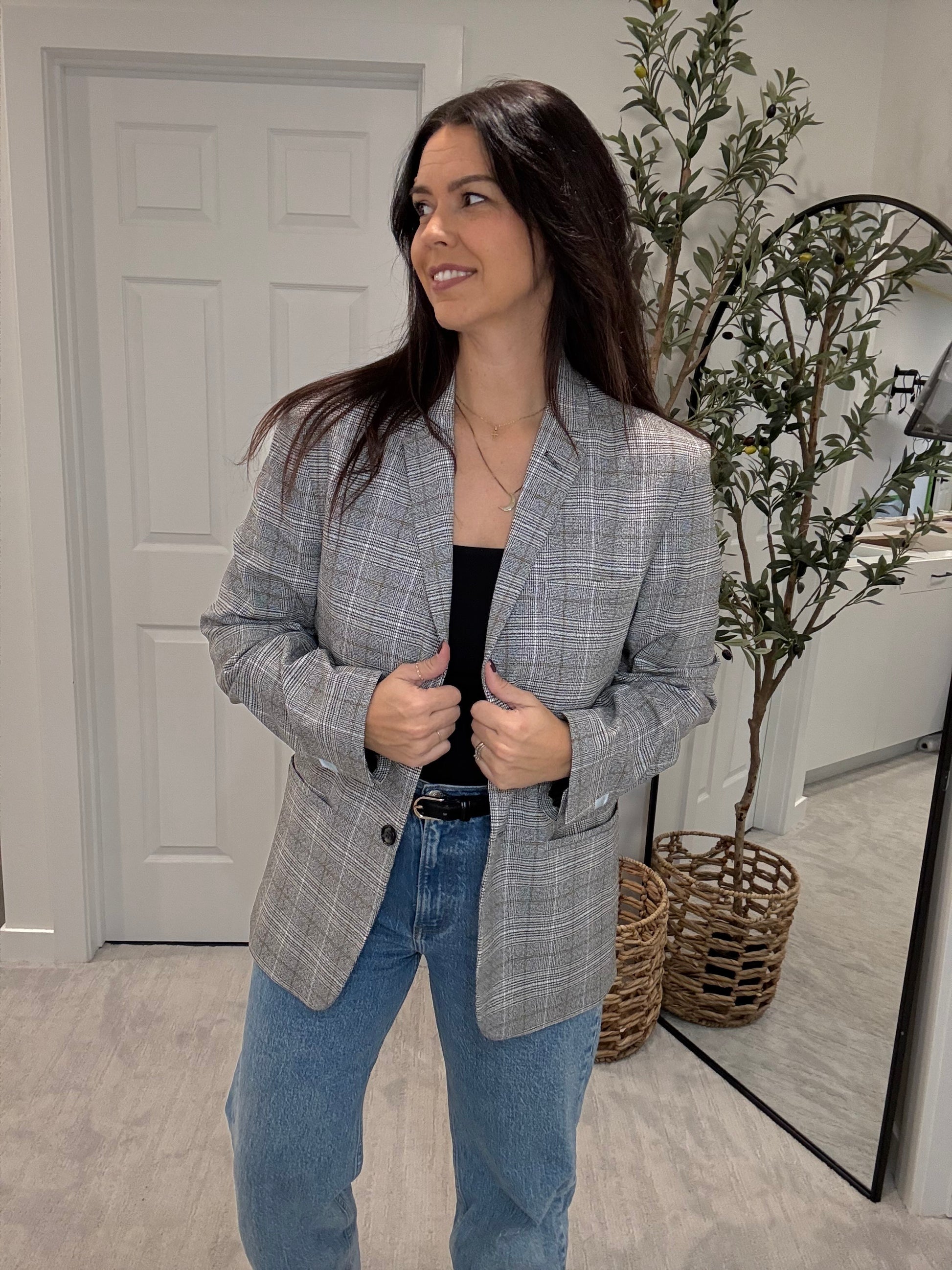 This blazer is unisex and final sale. Available in sizes S-XL. Tracey is 5'8" and wearing a size large for the perfect oversized fit.
